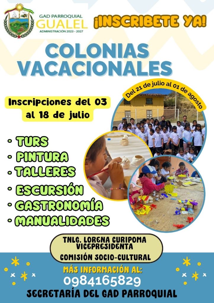 El Gobierno Autónomo Descentralizado Parroquial de Gualel les hace la cordial invitación a ser participes de las colonias vacacionales 2025.